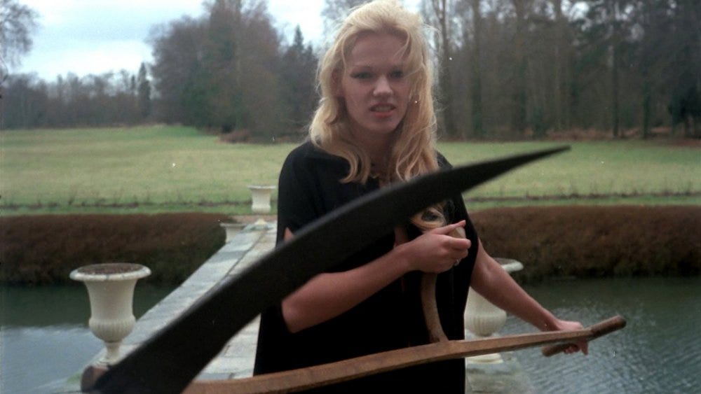 A naked Lahaie, half covered, scythe in hand, like a modernised grim reaper walking across the bridge to the château. Like some of Rollin’s based tableaus, it is both erotic and terrifying. It’s also no surprise. Rollin was a fan of the erotic and moonlighted making adult films to raise finances for his regular output.